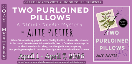 Prize package will include a signed hardcopy of Two Purloined Pillows (A Nimble Needle Mystery) by Allie Pleiter , bookmarks, and a Needlepoint starter kit.